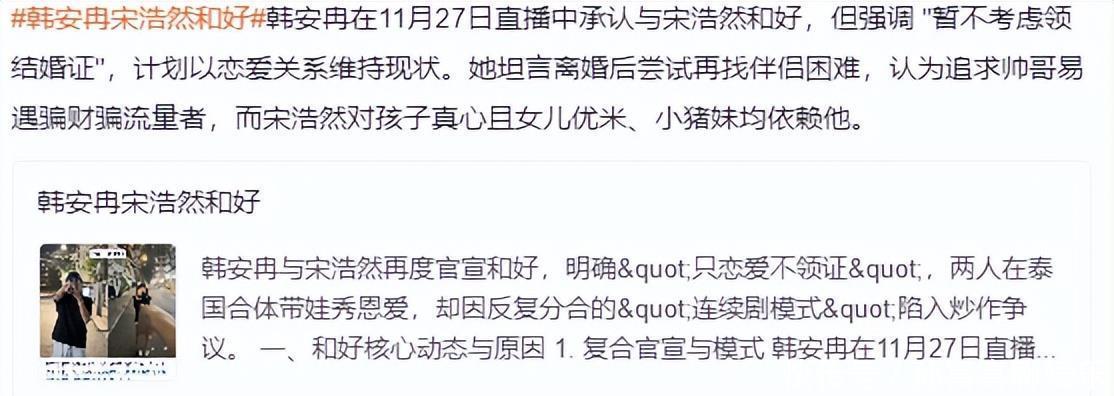 宋浩然那边也有感情洁癖,之前说过因为她太多前任,从来不叫她老婆,现在不领证正好俩人都自在。说不定这才是最适合他俩的相处模式,有娃有感情有钱赚,又不用担法律责任,多完美。不过话说回来,反复折腾对孩子真不好。
